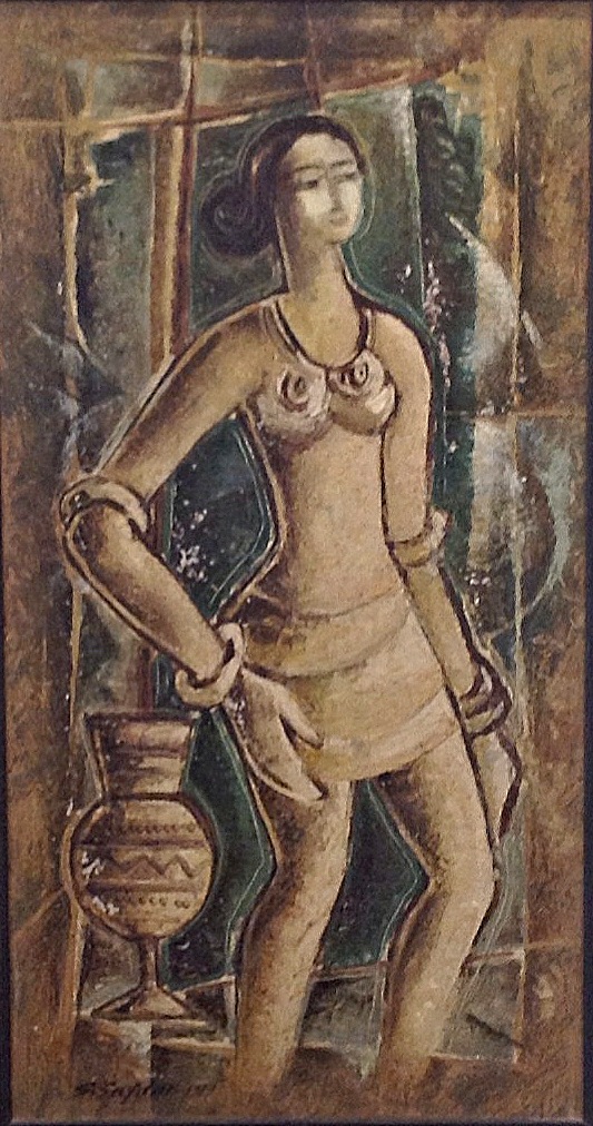 S. Safdar was a prolific painter and always took part in group exhibitions besides holding about a dozen one-man shows of his work. He was born in Gujrat in 1924 and made sets for films in Bombay. The artist designed stalls and set up an art sketch club between the years 1940-47. Quite often he laboured on the background to give it a Cubist look and somehow fitted the human figure of the woman into it as part of the linear pattern. Safdar is an old master and rarely is his work available. His paintings are in the collection of serious collectors