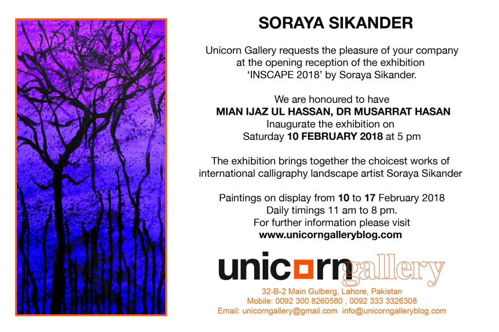 SORAYA SIKANDER ‘INSCAPE 2018‘ NEW PAINTINGS ON DISPLAY 10 TO 17 FEBRUARY 2018 AT UNICORN GALLERY E CATALOG